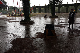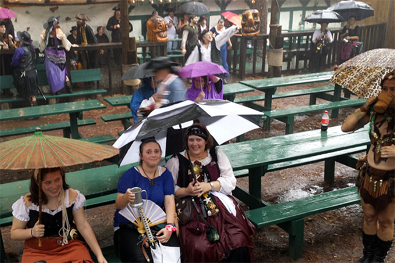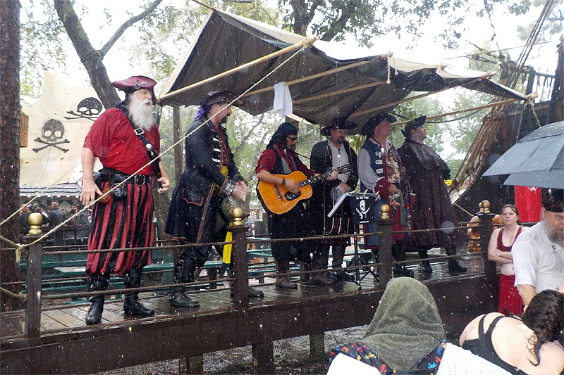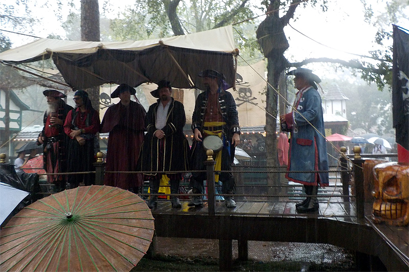 It was full-on rain, rain, and more rain (and not a little mud) as Cyclone Patricia came crashing into a cold front and made for a soggy Pirate's Adventure weekend at TRF. The totally drunk folk at the Sea Devil Tavern didn't seem to mind the rain much as there was much rum warming their veins, but the downpour prevented most people from being able to hear us beyond about 5 feet from the stage. Sunday was nicer as the rain was lightening and we were able to put on an actual show or two to the few dozen frigid patrons wandering the rain-soaked grounds of the festival. It might have put a damper on the weekend (literally), but we got more stories to tell!