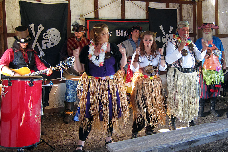 The grass skirts are pulled out and placed on the pumpettes to do some Caribbean style dancing for "Isle of Tortuga".